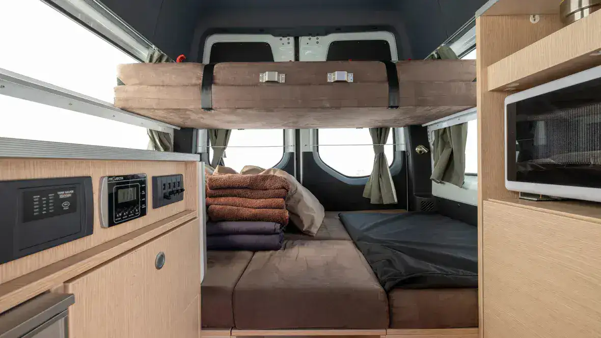 There are two double beds in the rear, one above the other, which can be pushed in to save space during the day and easily extended in the evening – both comfortable and functional.
