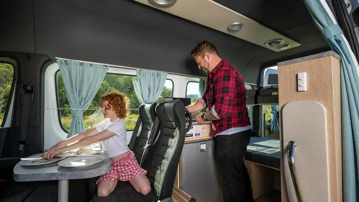 Thanks to the automatic transmission, reversing camera and optional roof tent model from 2025, the Voyager is the perfect campervan for anyone who wants to travel through Australia flexibly, comfortably and with a touch of adventure – even without a shower and toilet on board.